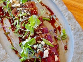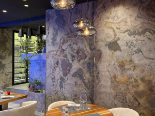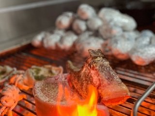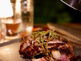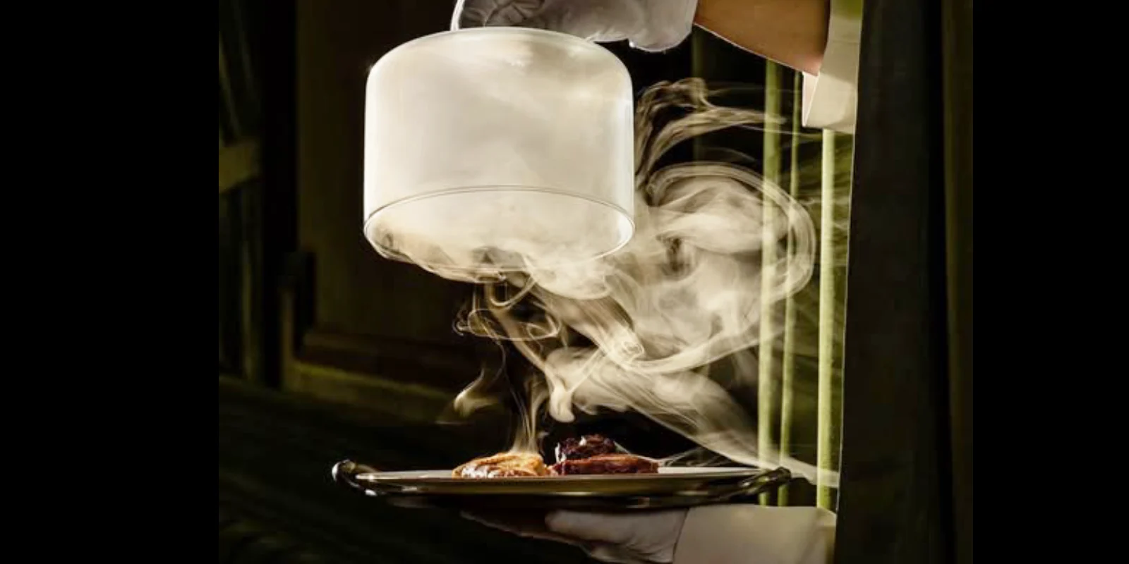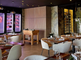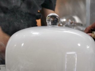 Chaque détail a été pensé pour votre confort et votre plaisir : assiettes en marbre, présentation sous cloche des côtes de bœuf fumées au bois d’olivier, couteaux ciselés à la main, cuillères en nacre.